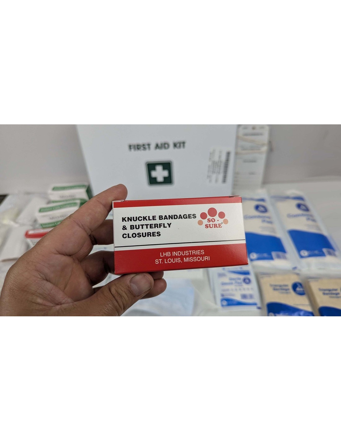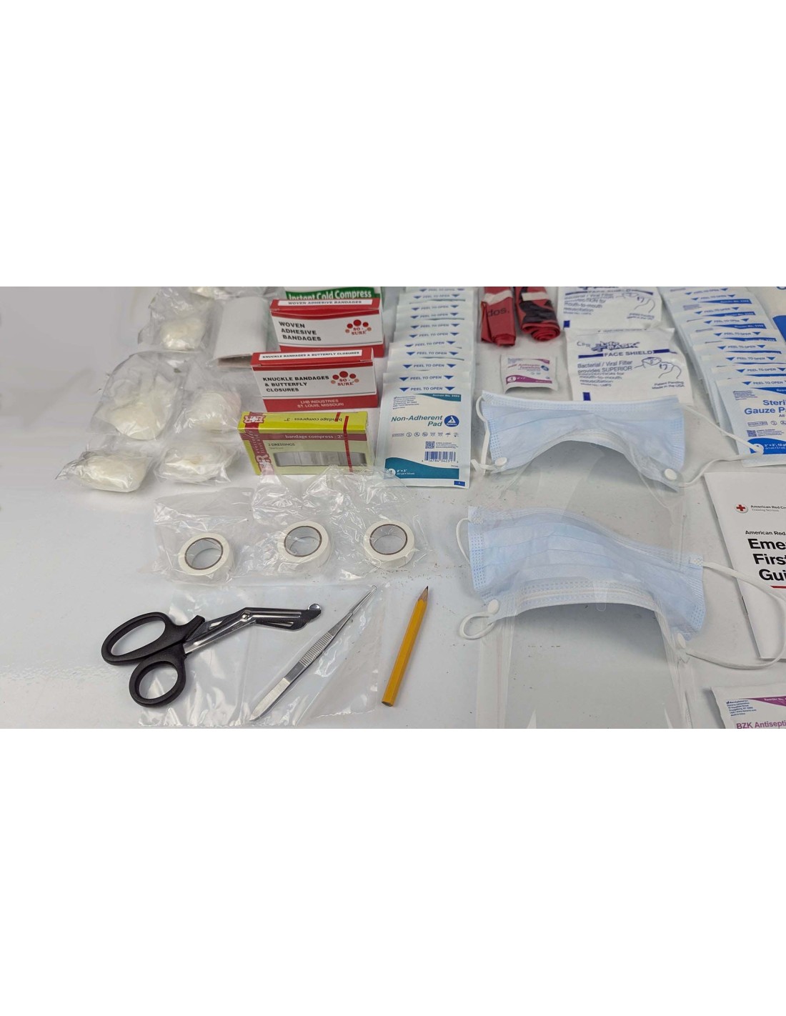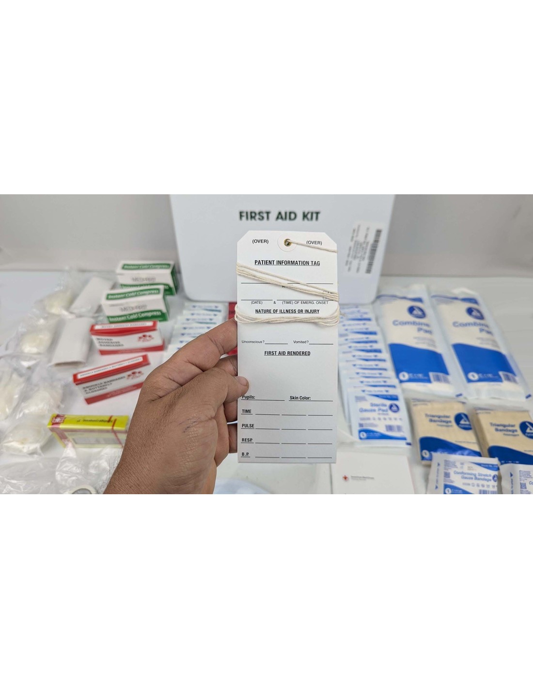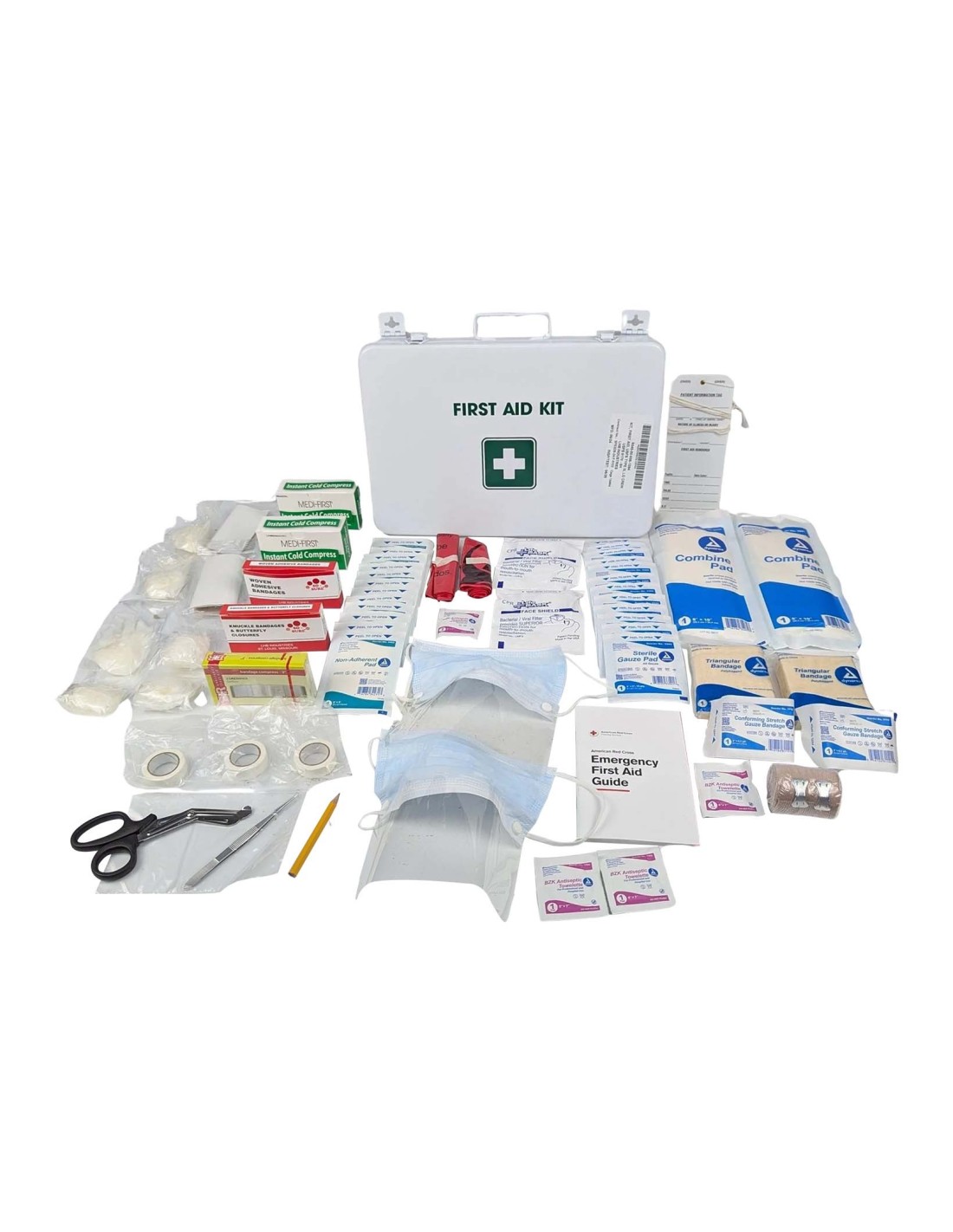 Este botiquín incluye aproximadamente 250 piezas organizadas para tratar una amplia variedad de lesiones comunes en el trabajo