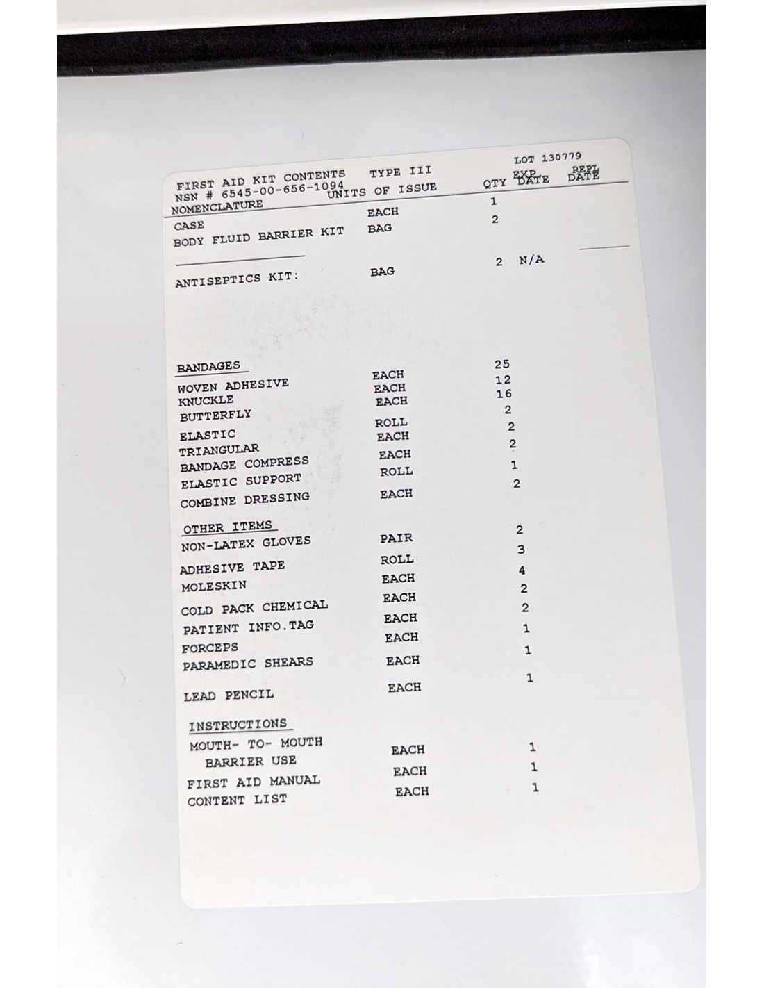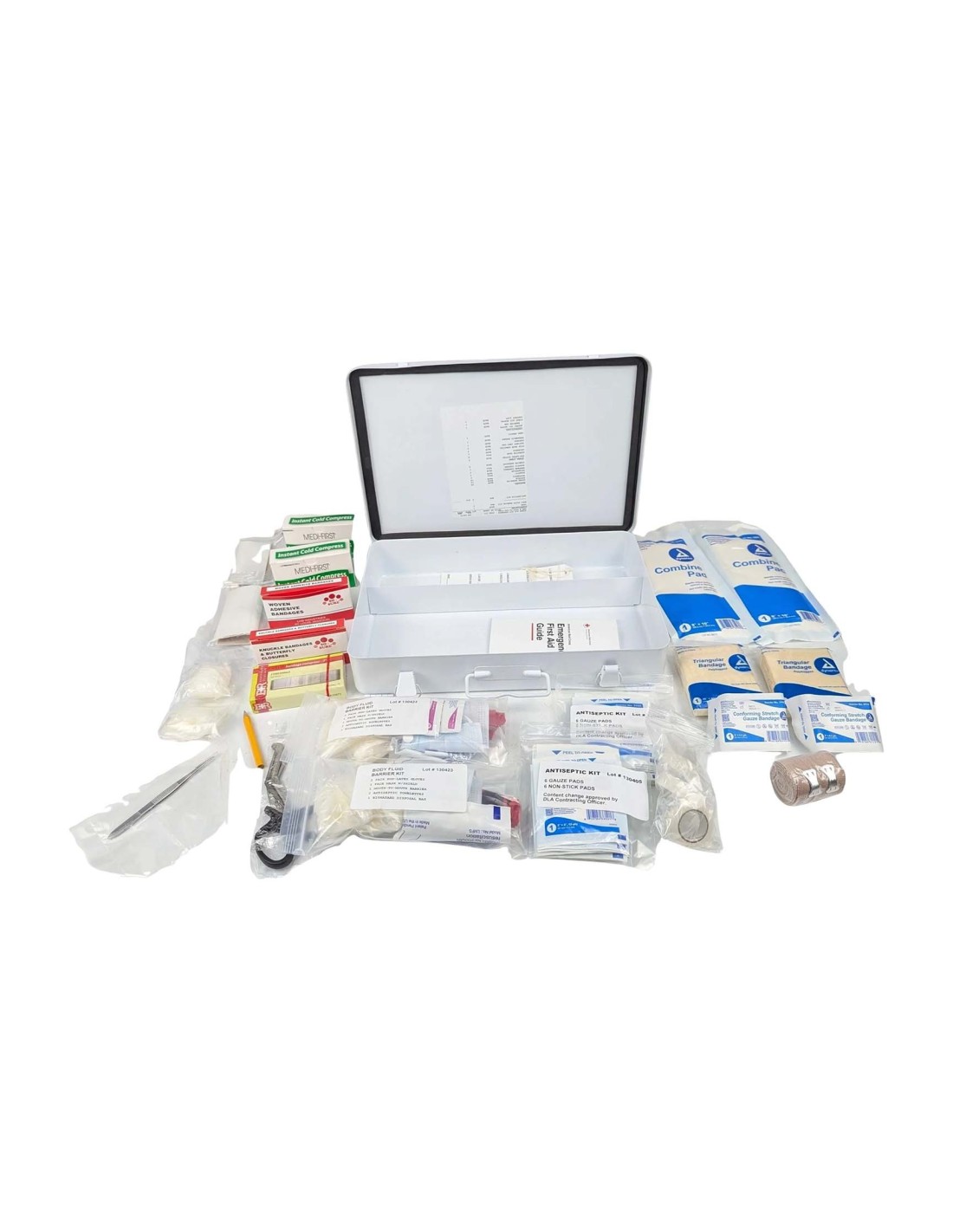 Este botiquín de primeros auxilios Tipo III modelo NSN 6545-00-656-1094 incluye todo lo necesario para proporcionar primeros auxilios