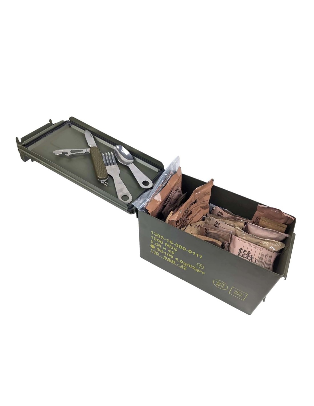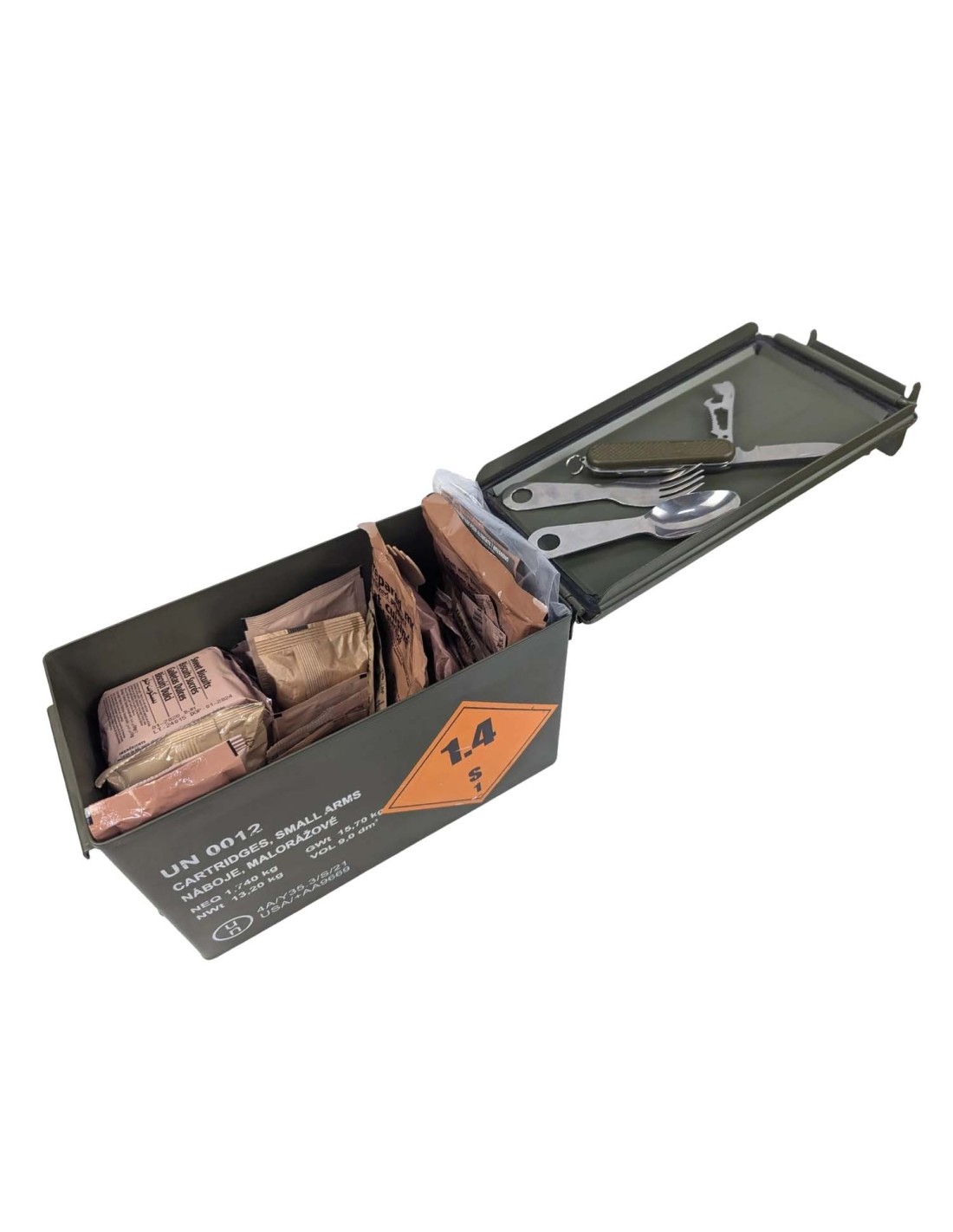 Lo primero recuerda que estas son raciones MRE de 24h por lo que contienen desayuno, almuerzo y cena. Podrás ver el contenido especifico de la ración algo más abajo. Junto con los cubiertos, la navaja y los regalos, todo se empaqueta en la caja de munición original. Disponemos de diferentes cajas de tamaño 30x15x19cm. La que ves en las fotos es una unidad al azar que refleja el estado general del lote. Pero la caja puede tener diferentes marcajes y/o pegatinas. Al ser cajas originales pueden tener algunos arañazos o pequeñas abolladuras, pero en general comprobarás que están en muy buen estado.