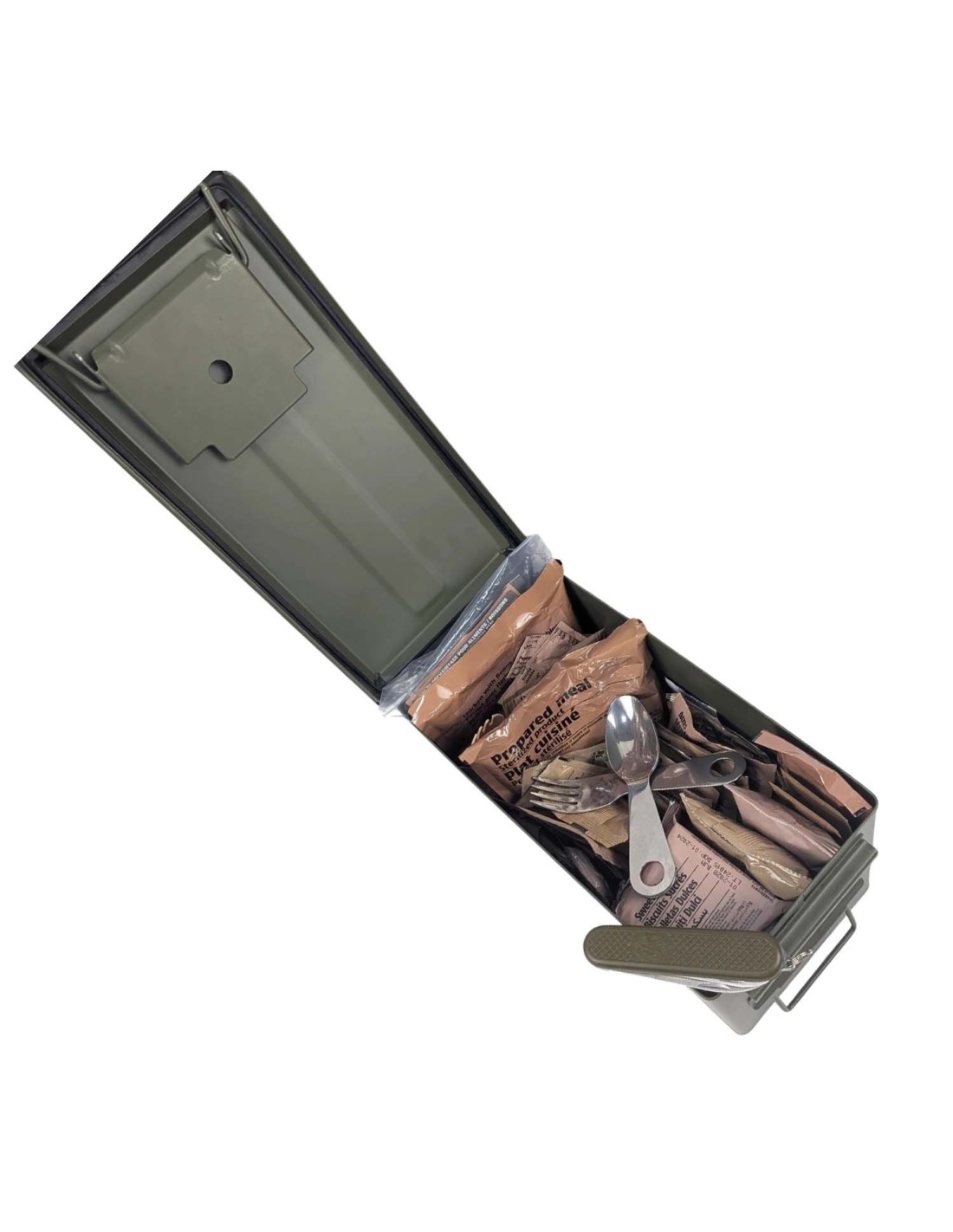 Como ya sabes, en Mylitaria puedes comprar por separado raciones de varios tipos, así como multitud de accesorios relacionados con la supervivencia y el preparacionismo. Pero en esta ocasión queremos ofrecerte un pack con desayuno, almuerzo, cena de raciones militares originales de las Naciones Unidas conjunto a una caja metálica de munición (vacía) estanca y un juego de cubiertos con navaja del ejercito español, para además sumarle las nuevas pegatinas de la temporada 17 de Mylitaria.